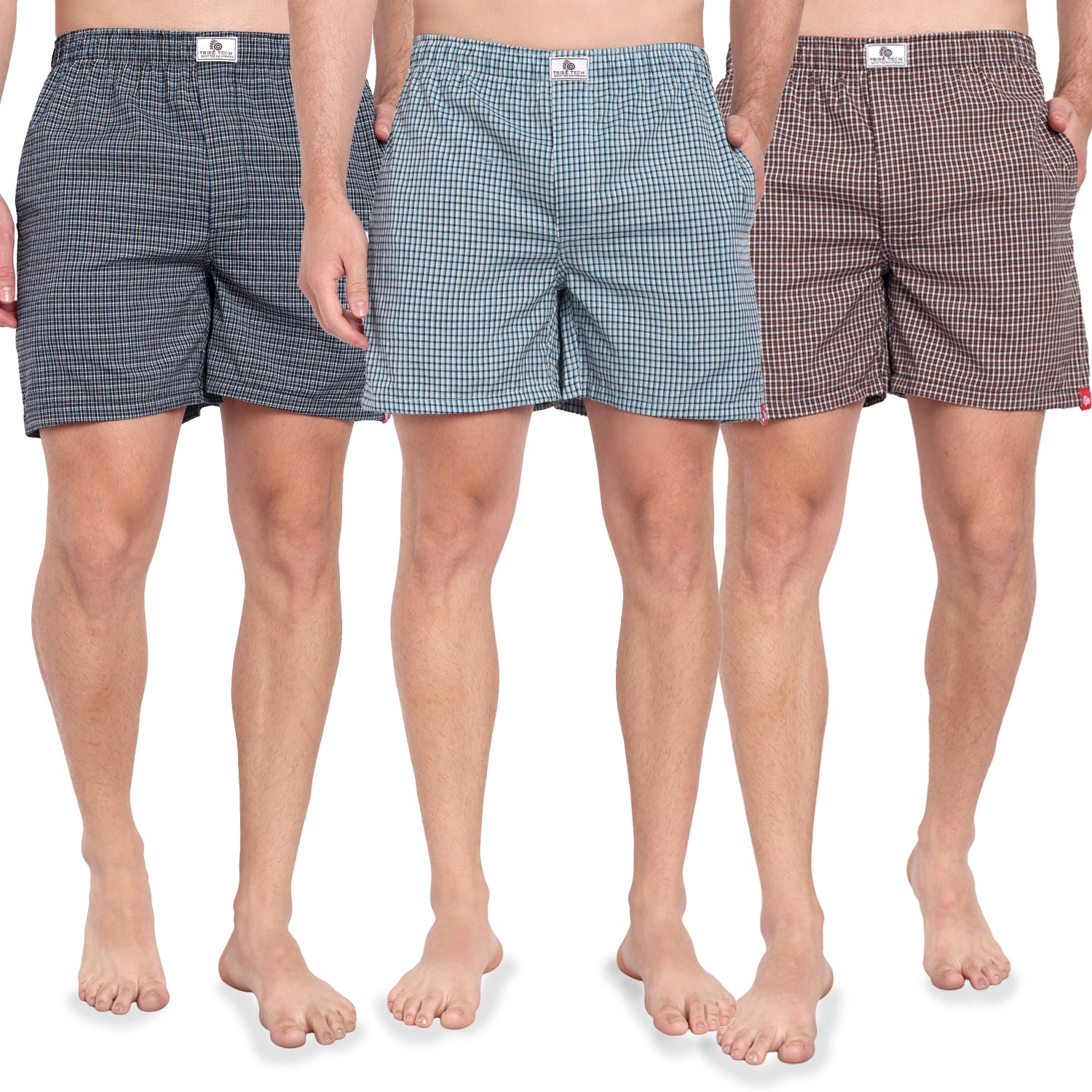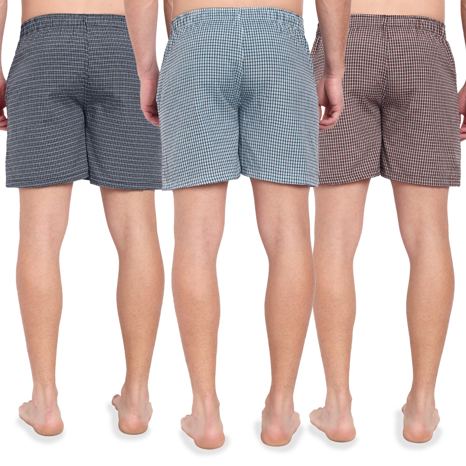 - VALUE PACK: Set of three boxer shorts in different plaid colour combinations - navy, light blue, and brown checks